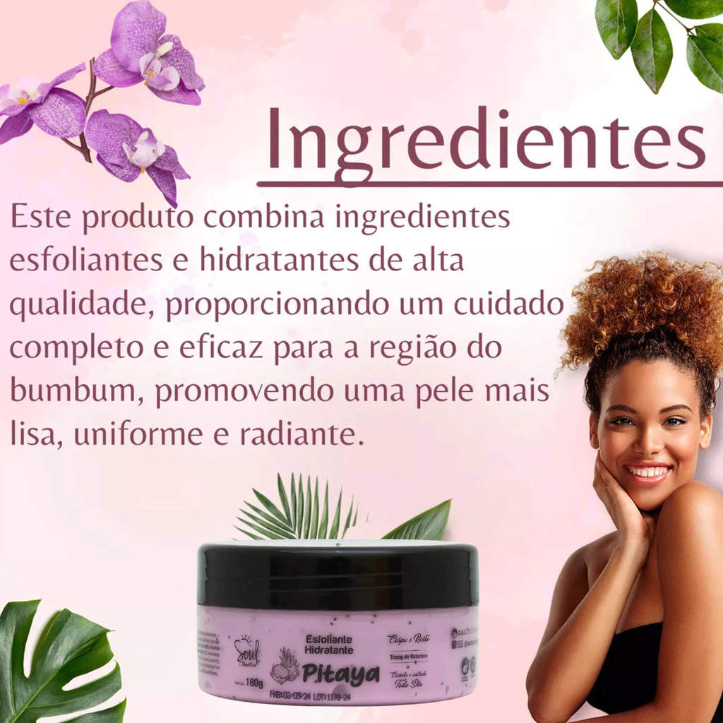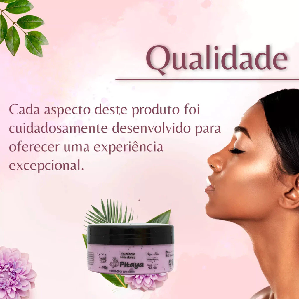Hidratante e Esfoliante Pitaya 2 em 1 da Soul Cosméticos, um produto que transforma sua rotina de cuidados com a pele. Com uma consistência cremosa, ele proporciona uma experiência sensorial única, enquanto hidrata e esfolia a pele de forma eficaz. Ideal para todos os tipos de pele, este produto é perfeito para quem busca uma pele suave e radiante.A fórmula hipoalérgica garante que mesmo as peles mais sensíveis possam desfrutar dos benefícios deste hidratante e esfoliante. Com uma aplicação focada no corpo, ele atua profundamente, promovendo uma hidratação que dura até 24 horas. Sinta a frescura e o aroma da melancia enquanto cuida da sua pele com um produto que respeita suas necessidades.Experimente a combinação perfeita de hidratação e esfoliação, e transforme sua pele em um verdadeiro convite ao toque. O pote prático facilita o uso diário, tornando este produto um aliado indispensável na sua rotina de beleza. Mantenha sua pele saudável e luminosa com o Hidratante e Esfoliante Pitaya 2 em 1 da Soul Cosméticos.Garantia do vendedor: 30 dias